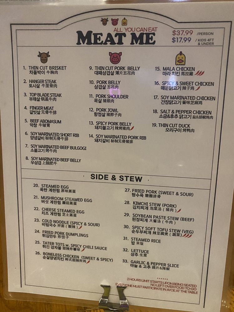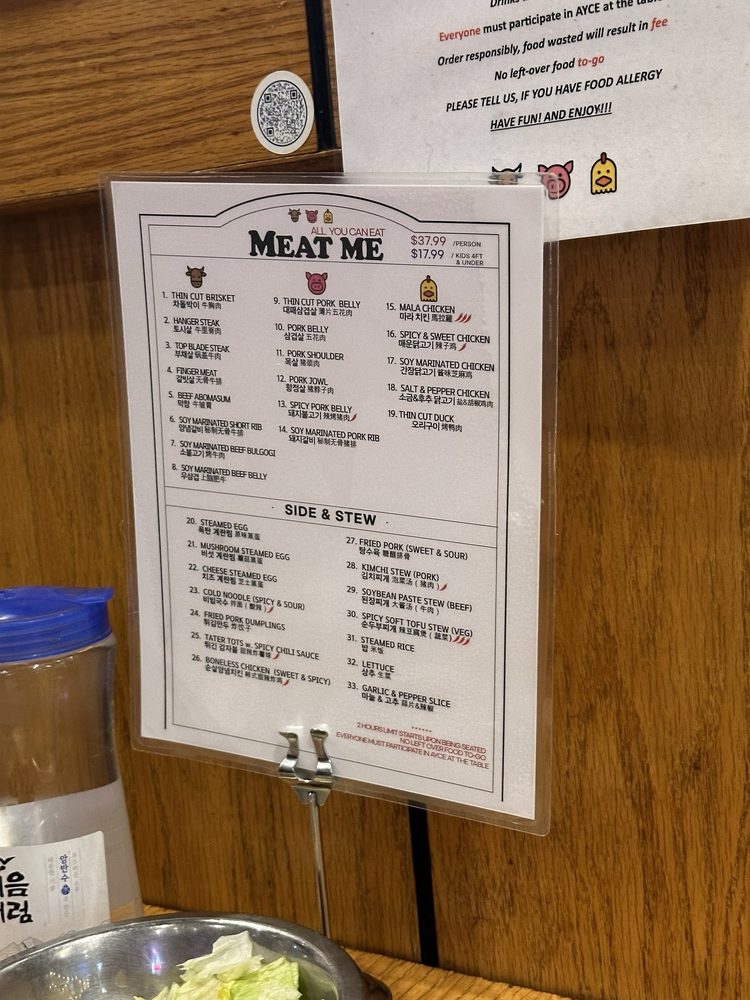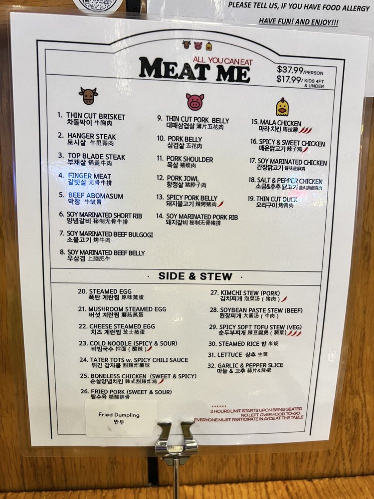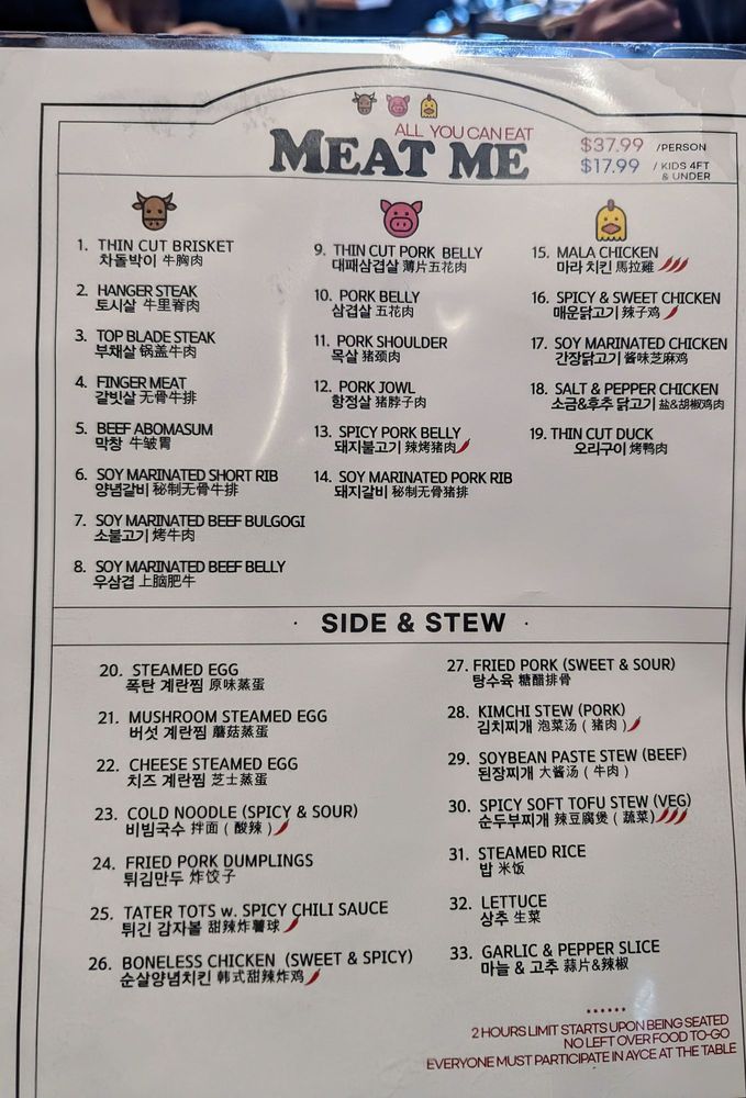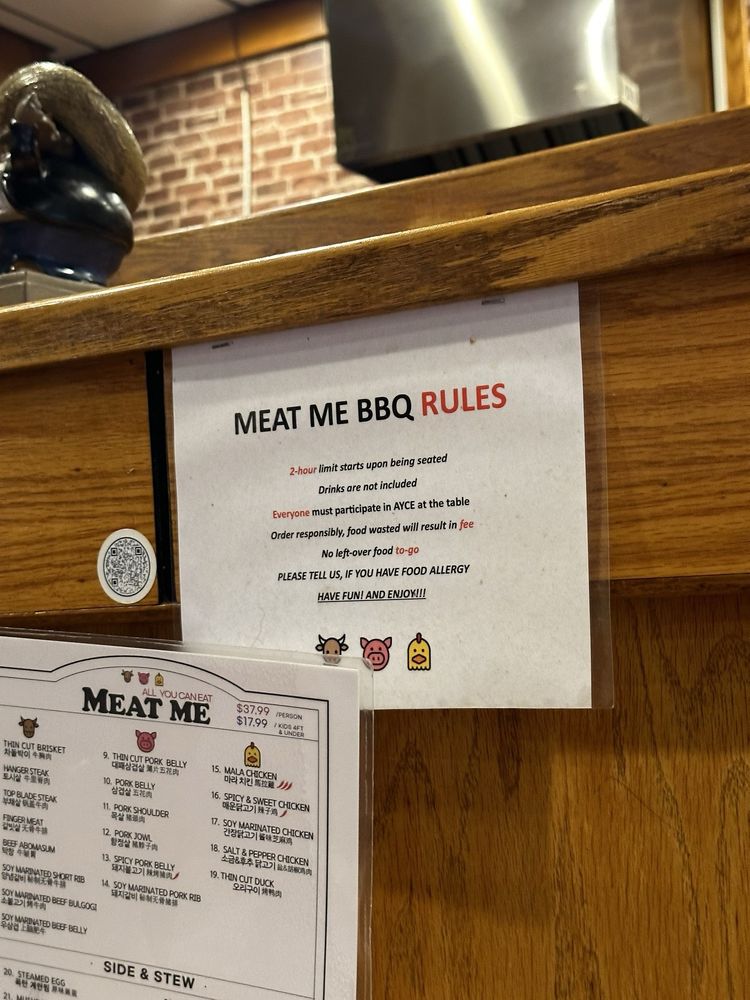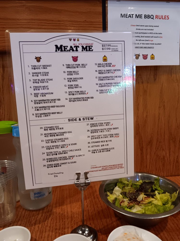Introducing Meat Me BBQ, a Korean barbecue restaurant in Flushing, NY. This trendy spot offers a variety of meats cooked to perfection by attentive servers. The menu includes all-you-can-eat options with delicious cuts like beef bulgogi, marinated short ribs, and soy marinated chicken. Customers rave about the generous portions and accommodating staff, making it a great value for the price. The casual atmosphere, heated outdoor seating, and wide selection of side dishes add to the overall dining experience. With options for takeout, delivery, and reservations, Meat Me BBQ is a must-visit for Korean barbecue enthusiasts. Whether you're looking for a fun night out with friends or a satisfying meal, this Asian-owned gem has something for everyone.